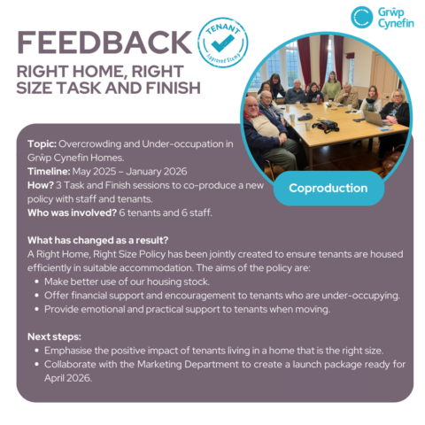 We’ve now completed the Right Home, Right Size Task and Finish sessions, where tenants and staff teamed up to shape a new policy addressing overcrowding and under‑occupation. Your input has helped us create a clearer, more supportive approach that will make better use of our homes and offer the right help to tenants who may need to move to a more suitable property.