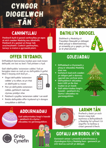 Mae dathliadau’r Nadolig a’r Flwyddyn Newydd yn gyfle i gael hwyl gyda theulu a ffrindiau, felly dilynwch ein cynghorion diogelwch tân syml er mwyn cadw pawb yn ddiogel i gael mwynhau miri’r ŵyl.