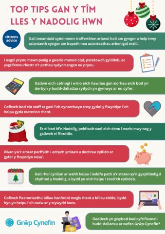 Fodd bynnag, mae’r un mor bwysig sicrhau eich bod yn parhau i dalu eich rhent, er mwyn osgoi mynd i ddyled. Gall rhoi cynllun ar waith helpu i leddfu peth o’r straen sy’n gysylltiedig â chyfnod y Nadolig a’r flwyddyn newydd a bydd yn eich helpu i reoli’ch cyllideb, gan gynnwys cronfa i dalu am daliadau debyd uniongyrchol – os mai dyma’r dull talu rydych wedi ei ddewis.