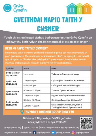 Hoffem wahodd tenantiaid i gymryd rhan mewn cymaint o’r gweithdai hyn â phosibl, ac rydym yn gobeithio y gallwch ein helpu i sicrhau bod gwasanaethau Grŵp Cynefin yn adlewyrchu beth rydych chi, fel tenantiaid, ei eisiau ac ei angen.