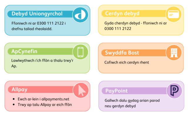 Byddwn yn codi rhent ar y dydd Llun bob wythnos. Er y byddai’n well gennym i chi dalu ar ddydd Llun, mi allwch chi dalu unrhyw ddiwrnod o’r wythnos cyn amser cinio dydd Sul yr wythnos honno.  Os byddai’n well gennych chi dalu bob pythefnos, 4 wythnos neu bob mis, mae croeso i chi wneud hynny ond bydd angen i ni gael y taliadau ymlaen llaw.